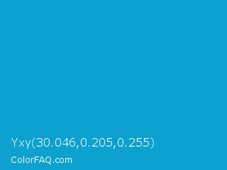 Yxy 30.046,0.205,0.255 Color is a normal blue color and the nearest color is Cerulean #02a4d3. Hex code #0ca1cf and RGB value is rgb(12,161,207). In RGB color space, this color is composed of 5% red, 63% green, 81% blue, In CMYK color space, this color is composed of 94% cyan, 22% magenta, 0% yellow , 19% black , In HSL color space, this color has a hue angle of 194° , 89% saturation and 43% lightness.