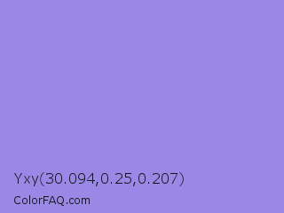 Yxy 30.094,0.25,0.207 Color is a light indigo color and the nearest color is Dull Lavender #a899e6. Hex code #9a88e6 and RGB value is rgb(154,136,230). In RGB color space, this color is composed of 60% red, 53% green, 90% blue, In CMYK color space, this color is composed of 33% cyan, 41% magenta, 0% yellow , 10% black , In HSL color space, this color has a hue angle of 251° , 65% saturation and 72% lightness.