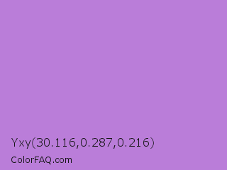 Yxy 30.116,0.287,0.216 Color is a light purple color and the nearest color is Lavender #b57edc. Hex code #ba7dd9 and RGB value is rgb(186,125,217). In RGB color space, this color is composed of 73% red, 49% green, 85% blue, In CMYK color space, this color is composed of 14% cyan, 42% magenta, 0% yellow , 15% black , In HSL color space, this color has a hue angle of 280° , 55% saturation and 67% lightness.