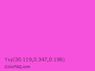 Yxy 30.119,0.347,0.196 Color is a light magenta color and the nearest color is Purple Pizzazz #fe4eda. Hex code #f54fdb and RGB value is rgb(245,79,219). In RGB color space, this color is composed of 96% red, 31% green, 86% blue, In CMYK color space, this color is composed of 0% cyan, 68% magenta, 11% yellow , 4% black , In HSL color space, this color has a hue angle of 309° , 89% saturation and 64% lightness.