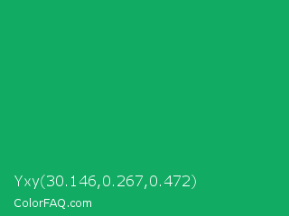 Yxy 30.146,0.267,0.472 Color is a normal green color and the nearest color is GO Green #00ab66. Hex code #12ab63 and RGB value is rgb(18,171,99). In RGB color space, this color is composed of 7% red, 67% green, 39% blue, In CMYK color space, this color is composed of 89% cyan, 0% magenta, 42% yellow , 33% black , In HSL color space, this color has a hue angle of 152° , 81% saturation and 37% lightness.