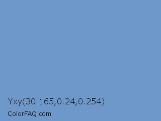 Yxy 30.165,0.24,0.254 Color is a light blue color and the nearest color is Cerulean Frost #6d9bc3. Hex code #6f98ca and RGB value is rgb(111,152,202). In RGB color space, this color is composed of 44% red, 60% green, 79% blue, In CMYK color space, this color is composed of 45% cyan, 25% magenta, 0% yellow , 21% black , In HSL color space, this color has a hue angle of 213° , 46% saturation and 61% lightness.