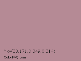 Yxy 30.171,0.349,0.314 Color is a light red color and the nearest color is English Lavender #b48395. Hex code #b58a95 and RGB value is rgb(181,138,149). In RGB color space, this color is composed of 71% red, 54% green, 58% blue, In CMYK color space, this color is composed of 0% cyan, 24% magenta, 18% yellow , 29% black , In HSL color space, this color has a hue angle of 345° , 23% saturation and 63% lightness.