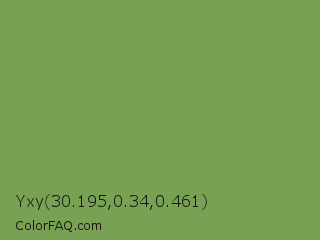 Yxy 30.195,0.34,0.461 Color is a normal green color and the nearest color is Asparagus Green #7ba05b. Hex code #79a154 and RGB value is rgb(121,161,84). In RGB color space, this color is composed of 47% red, 63% green, 33% blue, In CMYK color space, this color is composed of 25% cyan, 0% magenta, 48% yellow , 37% black , In HSL color space, this color has a hue angle of 91° , 31% saturation and 48% lightness.
