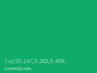 Yxy 30.247,0.263,0.459 Color is a normal green color and the nearest color is GO Green #00ab66. Hex code #10ab69 and RGB value is rgb(16,171,105). In RGB color space, this color is composed of 6% red, 67% green, 41% blue, In CMYK color space, this color is composed of 91% cyan, 0% magenta, 39% yellow , 33% black , In HSL color space, this color has a hue angle of 154° , 83% saturation and 37% lightness.