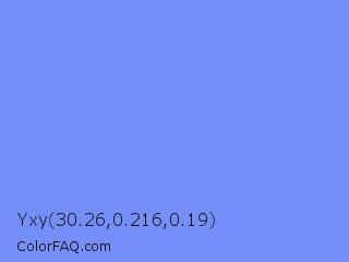Yxy 30.26,0.216,0.19 Color is a light blue color and the nearest color is Cornflower Blue #6495ed. Hex code #758ffa and RGB value is rgb(117,143,250). In RGB color space, this color is composed of 46% red, 56% green, 98% blue, In CMYK color space, this color is composed of 53% cyan, 43% magenta, 0% yellow , 2% black , In HSL color space, this color has a hue angle of 228° , 93% saturation and 72% lightness.
