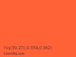 Yxy 30.271,0.554,0.362 Color is a light red color and the nearest color is Outrageous Orange Crayola #ff6037. Hex code #ff6237 and RGB value is rgb(255,98,55). In RGB color space, this color is composed of 100% red, 38% green, 22% blue, In CMYK color space, this color is composed of 0% cyan, 62% magenta, 78% yellow , 0% black , In HSL color space, this color has a hue angle of 13° , 100% saturation and 61% lightness.