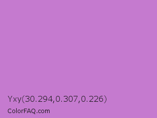 Yxy 30.294,0.307,0.226 Color is a light magenta color and the nearest color is French Mauve #d473d4. Hex code #c57acf and RGB value is rgb(197,122,207). In RGB color space, this color is composed of 77% red, 48% green, 81% blue, In CMYK color space, this color is composed of 5% cyan, 41% magenta, 0% yellow , 19% black , In HSL color space, this color has a hue angle of 293° , 47% saturation and 65% lightness.
