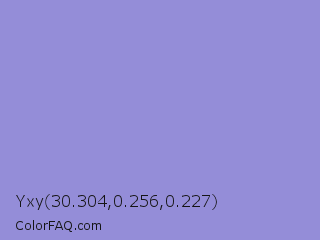 Yxy 30.304,0.256,0.227 Color is a light indigo color and the nearest color is Blue Bell Crayola #9999cc. Hex code #948dd8 and RGB value is rgb(148,141,216). In RGB color space, this color is composed of 58% red, 55% green, 85% blue, In CMYK color space, this color is composed of 31% cyan, 35% magenta, 0% yellow , 15% black , In HSL color space, this color has a hue angle of 246° , 49% saturation and 70% lightness.