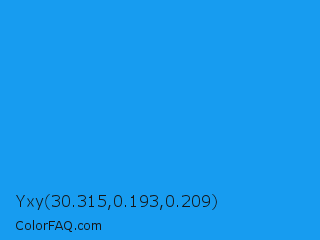 Yxy 30.315,0.193,0.209 Color is a normal blue color and the nearest color is Button Blue #24a0ed. Hex code #179cf0 and RGB value is rgb(23,156,240). In RGB color space, this color is composed of 9% red, 61% green, 94% blue, In CMYK color space, this color is composed of 90% cyan, 35% magenta, 0% yellow , 6% black , In HSL color space, this color has a hue angle of 203° , 88% saturation and 52% lightness.