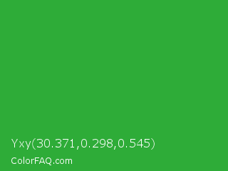 Yxy 30.371,0.298,0.545 Color is a normal green color and the nearest color is Wageningen Green #34b233. Hex code #2eac38 and RGB value is rgb(46,172,56). In RGB color space, this color is composed of 18% red, 67% green, 22% blue, In CMYK color space, this color is composed of 73% cyan, 0% magenta, 67% yellow , 33% black , In HSL color space, this color has a hue angle of 125° , 58% saturation and 43% lightness.