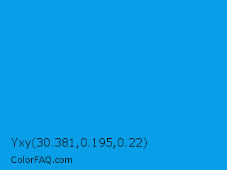 Yxy 30.381,0.195,0.22 Color is a normal blue color and the nearest color is Vivid Cerulean #00aaee. Hex code #099ee8 and RGB value is rgb(9,158,232). In RGB color space, this color is composed of 4% red, 62% green, 91% blue, In CMYK color space, this color is composed of 96% cyan, 32% magenta, 0% yellow , 9% black , In HSL color space, this color has a hue angle of 200° , 93% saturation and 47% lightness.
