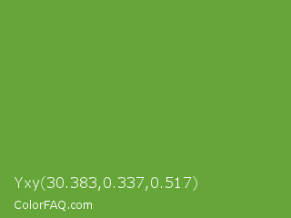 Yxy 30.383,0.337,0.517 Color is a normal green color and the nearest color is Green RYB #66b032. Hex code #66a638 and RGB value is rgb(102,166,56). In RGB color space, this color is composed of 40% red, 65% green, 22% blue, In CMYK color space, this color is composed of 39% cyan, 0% magenta, 66% yellow , 35% black , In HSL color space, this color has a hue angle of 95° , 50% saturation and 44% lightness.