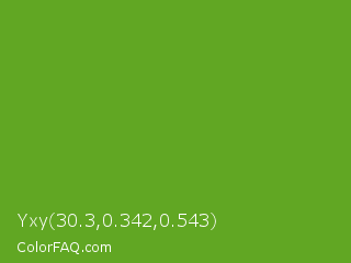 Yxy 30.3,0.342,0.543 Color is a normal green color and the nearest color is Christi #67a712. Hex code #61a723 and RGB value is rgb(97,167,35). In RGB color space, this color is composed of 38% red, 65% green, 14% blue, In CMYK color space, this color is composed of 42% cyan, 0% magenta, 79% yellow , 35% black , In HSL color space, this color has a hue angle of 92° , 65% saturation and 40% lightness.