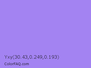 Yxy 30.43,0.249,0.193 Color is a light indigo color and the nearest color is Dull Lavender #a899e6. Hex code #a383f2 and RGB value is rgb(163,131,242). In RGB color space, this color is composed of 64% red, 51% green, 95% blue, In CMYK color space, this color is composed of 33% cyan, 46% magenta, 0% yellow , 5% black , In HSL color space, this color has a hue angle of 257° , 81% saturation and 73% lightness.