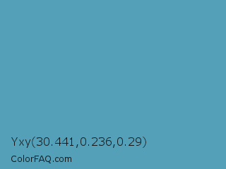 Yxy 30.441,0.236,0.29 Color is a normal blue color and the nearest color is Hippie Blue #589aaf. Hex code #53a0b8 and RGB value is rgb(83,160,184). In RGB color space, this color is composed of 33% red, 63% green, 72% blue, In CMYK color space, this color is composed of 55% cyan, 13% magenta, 0% yellow , 28% black , In HSL color space, this color has a hue angle of 194° , 42% saturation and 52% lightness.