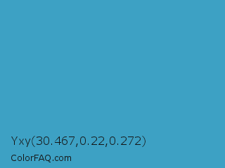Yxy 30.467,0.22,0.272 Color is a normal blue color and the nearest color is Pelorous #3eabbf. Hex code #3da1c4 and RGB value is rgb(61,161,196). In RGB color space, this color is composed of 24% red, 63% green, 77% blue, In CMYK color space, this color is composed of 69% cyan, 18% magenta, 0% yellow , 23% black , In HSL color space, this color has a hue angle of 196° , 53% saturation and 50% lightness.
