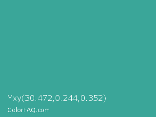 Yxy 30.472,0.244,0.352 Color is a normal cyan color and the nearest color is Zomp #39a78e. Hex code #3aa699 and RGB value is rgb(58,166,153). In RGB color space, this color is composed of 23% red, 65% green, 60% blue, In CMYK color space, this color is composed of 65% cyan, 0% magenta, 8% yellow , 35% black , In HSL color space, this color has a hue angle of 173° , 48% saturation and 44% lightness.