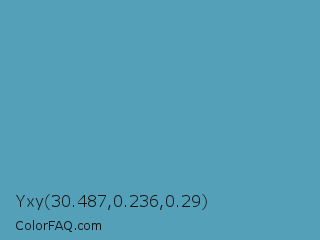 Yxy 30.487,0.236,0.29 Color is a normal blue color and the nearest color is Hippie Blue #589aaf. Hex code #53a0b8 and RGB value is rgb(83,160,184). In RGB color space, this color is composed of 33% red, 63% green, 72% blue, In CMYK color space, this color is composed of 55% cyan, 13% magenta, 0% yellow , 28% black , In HSL color space, this color has a hue angle of 194° , 42% saturation and 52% lightness.