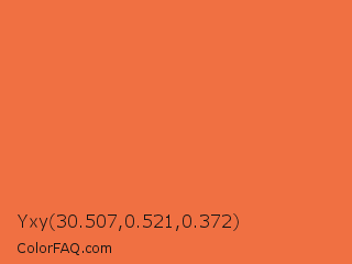 Yxy 30.507,0.521,0.372 Color is a normal orange color and the nearest color is Mandarin #f37a48. Hex code #f07042 and RGB value is rgb(240,112,66). In RGB color space, this color is composed of 94% red, 44% green, 26% blue, In CMYK color space, this color is composed of 0% cyan, 53% magenta, 73% yellow , 6% black , In HSL color space, this color has a hue angle of 16° , 85% saturation and 60% lightness.