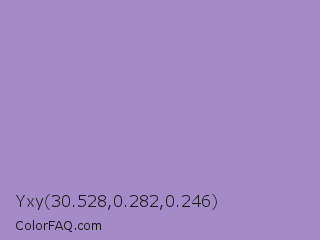 Yxy 30.528,0.282,0.246 Color is a light violet color and the nearest color is East Side #ac91ce. Hex code #a48bc8 and RGB value is rgb(164,139,200). In RGB color space, this color is composed of 64% red, 55% green, 78% blue, In CMYK color space, this color is composed of 18% cyan, 31% magenta, 0% yellow , 22% black , In HSL color space, this color has a hue angle of 265° , 36% saturation and 66% lightness.