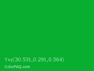 Yxy 30.531,0.291,0.564 Color is a normal green color and the nearest color is Green Pantone #00ad43. Hex code #07ae30 and RGB value is rgb(7,174,48). In RGB color space, this color is composed of 3% red, 68% green, 19% blue, In CMYK color space, this color is composed of 96% cyan, 0% magenta, 72% yellow , 32% black , In HSL color space, this color has a hue angle of 135° , 92% saturation and 35% lightness.