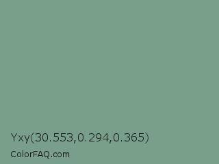 Yxy 30.553,0.294,0.365 Color is a normal green color and the nearest color is Oxley #779e86. Hex code #779f8a and RGB value is rgb(119,159,138). In RGB color space, this color is composed of 47% red, 62% green, 54% blue, In CMYK color space, this color is composed of 25% cyan, 0% magenta, 13% yellow , 38% black , In HSL color space, this color has a hue angle of 149° , 17% saturation and 55% lightness.