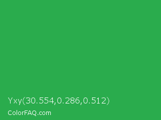 Yxy 30.554,0.286,0.512 Color is a normal green color and the nearest color is Wageningen Green #34b233. Hex code #2aac4d and RGB value is rgb(42,172,77). In RGB color space, this color is composed of 16% red, 67% green, 30% blue, In CMYK color space, this color is composed of 76% cyan, 0% magenta, 55% yellow , 33% black , In HSL color space, this color has a hue angle of 136° , 61% saturation and 42% lightness.