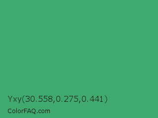 Yxy 30.558,0.275,0.441 Color is a normal green color and the nearest color is Ocean Green #41aa78. Hex code #3fa96e and RGB value is rgb(63,169,110). In RGB color space, this color is composed of 25% red, 66% green, 43% blue, In CMYK color space, this color is composed of 63% cyan, 0% magenta, 35% yellow , 34% black , In HSL color space, this color has a hue angle of 147° , 46% saturation and 45% lightness.