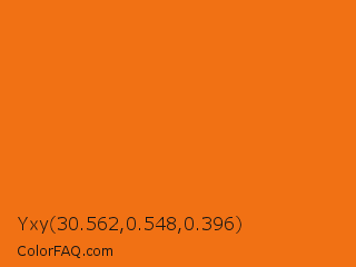 Yxy 30.562,0.548,0.396 Color is a normal orange color and the nearest color is Ecstasy #fa7814. Hex code #f17114 and RGB value is rgb(241,113,20). In RGB color space, this color is composed of 95% red, 44% green, 8% blue, In CMYK color space, this color is composed of 0% cyan, 53% magenta, 92% yellow , 5% black , In HSL color space, this color has a hue angle of 25° , 89% saturation and 51% lightness.