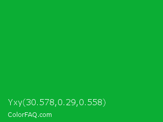 Yxy 30.578,0.29,0.558 Color is a normal green color and the nearest color is Green Pantone #00ad43. Hex code #0bae34 and RGB value is rgb(11,174,52). In RGB color space, this color is composed of 4% red, 68% green, 20% blue, In CMYK color space, this color is composed of 94% cyan, 0% magenta, 70% yellow , 32% black , In HSL color space, this color has a hue angle of 135° , 88% saturation and 36% lightness.