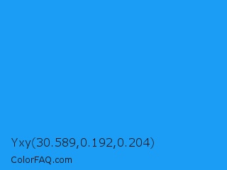 Yxy 30.589,0.192,0.204 Color is a normal blue color and the nearest color is Button Blue #24a0ed. Hex code #1b9cf5 and RGB value is rgb(27,156,245). In RGB color space, this color is composed of 11% red, 61% green, 96% blue, In CMYK color space, this color is composed of 89% cyan, 36% magenta, 0% yellow , 4% black , In HSL color space, this color has a hue angle of 204° , 92% saturation and 53% lightness.