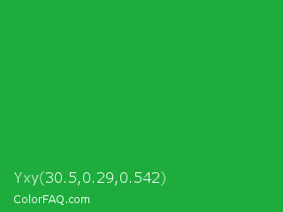 Yxy 30.5,0.29,0.542 Color is a normal green color and the nearest color is Wageningen Green #34b233. Hex code #1ead3d and RGB value is rgb(30,173,61). In RGB color space, this color is composed of 12% red, 68% green, 24% blue, In CMYK color space, this color is composed of 83% cyan, 0% magenta, 65% yellow , 32% black , In HSL color space, this color has a hue angle of 133° , 70% saturation and 40% lightness.
