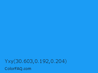 Yxy 30.603,0.192,0.204 Color is a normal blue color and the nearest color is Button Blue #24a0ed. Hex code #1b9cf5 and RGB value is rgb(27,156,245). In RGB color space, this color is composed of 11% red, 61% green, 96% blue, In CMYK color space, this color is composed of 89% cyan, 36% magenta, 0% yellow , 4% black , In HSL color space, this color has a hue angle of 204° , 92% saturation and 53% lightness.