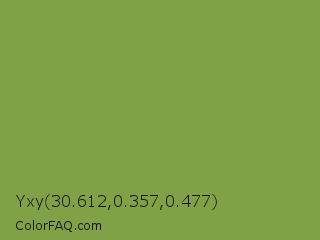 Yxy 30.612,0.357,0.477 Color is a normal green color and the nearest color is Sushi #87ab39. Hex code #81a147 and RGB value is rgb(129,161,71). In RGB color space, this color is composed of 51% red, 63% green, 28% blue, In CMYK color space, this color is composed of 20% cyan, 0% magenta, 56% yellow , 37% black , In HSL color space, this color has a hue angle of 81° , 39% saturation and 45% lightness.