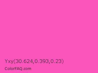 Yxy 30.624,0.393,0.23 Color is a light magenta color and the nearest color is Light Deep Pink #ff5ccd. Hex code #fc54bb and RGB value is rgb(252,84,187). In RGB color space, this color is composed of 99% red, 33% green, 73% blue, In CMYK color space, this color is composed of 0% cyan, 67% magenta, 26% yellow , 1% black , In HSL color space, this color has a hue angle of 323° , 97% saturation and 66% lightness.