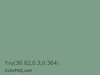 Yxy 30.62,0.3,0.364 Color is a normal green color and the nearest color is Oxley #779e86. Hex code #7d9e89 and RGB value is rgb(125,158,137). In RGB color space, this color is composed of 49% red, 62% green, 54% blue, In CMYK color space, this color is composed of 21% cyan, 0% magenta, 13% yellow , 38% black , In HSL color space, this color has a hue angle of 142° , 15% saturation and 55% lightness.