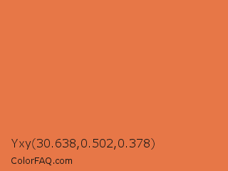 Yxy 30.638,0.502,0.378 Color is a normal orange color and the nearest color is Burnt Sienna #e97451. Hex code #e77747 and RGB value is rgb(231,119,71). In RGB color space, this color is composed of 91% red, 47% green, 28% blue, In CMYK color space, this color is composed of 0% cyan, 48% magenta, 69% yellow , 9% black , In HSL color space, this color has a hue angle of 18° , 77% saturation and 59% lightness.