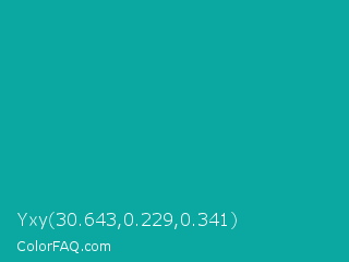 Yxy 30.643,0.229,0.341 Color is a normal cyan color and the nearest color is Persian Green #00a693. Hex code #0aa8a1 and RGB value is rgb(10,168,161). In RGB color space, this color is composed of 4% red, 66% green, 63% blue, In CMYK color space, this color is composed of 94% cyan, 0% magenta, 4% yellow , 34% black , In HSL color space, this color has a hue angle of 177° , 89% saturation and 35% lightness.