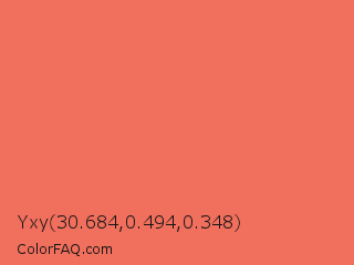 Yxy 30.684,0.494,0.348 Color is a light red color and the nearest color is Bittersweet #fe6f5e. Hex code #f06f5d and RGB value is rgb(240,111,93). In RGB color space, this color is composed of 94% red, 44% green, 36% blue, In CMYK color space, this color is composed of 0% cyan, 54% magenta, 61% yellow , 6% black , In HSL color space, this color has a hue angle of 7° , 83% saturation and 65% lightness.