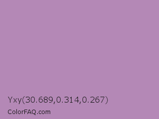 Yxy 30.689,0.314,0.267 Color is a light magenta color and the nearest color is African Violet #b284be. Hex code #b488b6 and RGB value is rgb(180,136,182). In RGB color space, this color is composed of 71% red, 53% green, 71% blue, In CMYK color space, this color is composed of 1% cyan, 25% magenta, 0% yellow , 29% black , In HSL color space, this color has a hue angle of 297° , 24% saturation and 62% lightness.