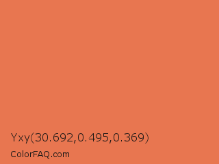 Yxy 30.692,0.495,0.369 Color is a light color and the nearest color is Burnt Sienna #e97451. Hex code #e87650 and RGB value is rgb(232,118,80). In RGB color space, this color is composed of 91% red, 46% green, 31% blue, In CMYK color space, this color is composed of 0% cyan, 49% magenta, 66% yellow , 9% black , In HSL color space, this color has a hue angle of 15° , 77% saturation and 61% lightness.