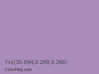Yxy 30.694,0.299,0.266 Color is a light purple color and the nearest color is Glossy Grape #ab92b3. Hex code #a98cb9 and RGB value is rgb(169,140,185). In RGB color space, this color is composed of 66% red, 55% green, 73% blue, In CMYK color space, this color is composed of 9% cyan, 24% magenta, 0% yellow , 27% black , In HSL color space, this color has a hue angle of 279° , 24% saturation and 64% lightness.