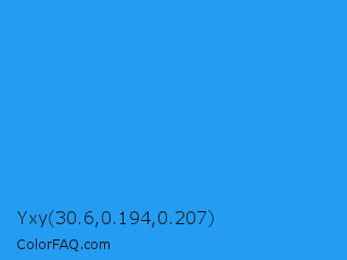 Yxy 30.6,0.194,0.207 Color is a normal blue color and the nearest color is Button Blue #24a0ed. Hex code #249cf2 and RGB value is rgb(36,156,242). In RGB color space, this color is composed of 14% red, 61% green, 95% blue, In CMYK color space, this color is composed of 85% cyan, 36% magenta, 0% yellow , 5% black , In HSL color space, this color has a hue angle of 205° , 89% saturation and 55% lightness.