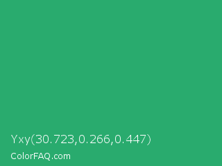 Yxy 30.723,0.266,0.447 Color is a normal green color and the nearest color is Green Crayola #1cac78. Hex code #29ab6e and RGB value is rgb(41,171,110). In RGB color space, this color is composed of 16% red, 67% green, 43% blue, In CMYK color space, this color is composed of 76% cyan, 0% magenta, 36% yellow , 33% black , In HSL color space, this color has a hue angle of 152° , 61% saturation and 42% lightness.