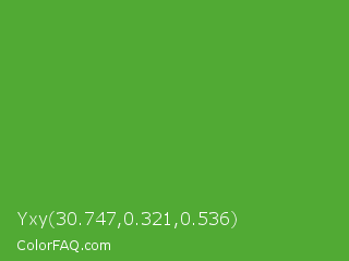 Yxy 30.747,0.321,0.536 Color is a normal green color and the nearest color is Apple #4fa83d. Hex code #51aa34 and RGB value is rgb(81,170,52). In RGB color space, this color is composed of 32% red, 67% green, 20% blue, In CMYK color space, this color is composed of 52% cyan, 0% magenta, 69% yellow , 33% black , In HSL color space, this color has a hue angle of 105° , 53% saturation and 44% lightness.