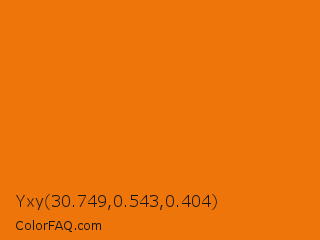 Yxy 30.749,0.543,0.404 Color is a normal orange color and the nearest color is Christine #e7730a. Hex code #ed750a and RGB value is rgb(237,117,10). In RGB color space, this color is composed of 93% red, 46% green, 4% blue, In CMYK color space, this color is composed of 0% cyan, 51% magenta, 96% yellow , 7% black , In HSL color space, this color has a hue angle of 28° , 92% saturation and 48% lightness.