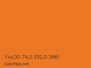 Yxy 30.74,0.532,0.398 Color is a normal orange color and the nearest color is Vivid Tangelo #f07427. Hex code #eb7624 and RGB value is rgb(235,118,36). In RGB color space, this color is composed of 92% red, 46% green, 14% blue, In CMYK color space, this color is composed of 0% cyan, 50% magenta, 85% yellow , 8% black , In HSL color space, this color has a hue angle of 25° , 83% saturation and 53% lightness.