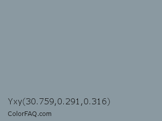 Yxy 30.759,0.291,0.316 Color is a normal blue color and the nearest color is Regent Gray #86949f. Hex code #8a99a1 and RGB value is rgb(138,153,161). In RGB color space, this color is composed of 54% red, 60% green, 63% blue, In CMYK color space, this color is composed of 14% cyan, 5% magenta, 0% yellow , 37% black , In HSL color space, this color has a hue angle of 201° , 11% saturation and 59% lightness.
