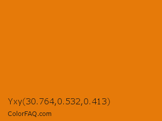 Yxy 30.764,0.532,0.413 Color is a normal orange color and the nearest color is Tahiti Gold #e97c07. Hex code #e67a09 and RGB value is rgb(230,122,9). In RGB color space, this color is composed of 90% red, 48% green, 4% blue, In CMYK color space, this color is composed of 0% cyan, 47% magenta, 96% yellow , 10% black , In HSL color space, this color has a hue angle of 31° , 92% saturation and 47% lightness.